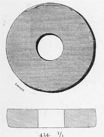 b. Spinnehjul av kleber, av enkel, sylinderisk form, R.434, uten spor av ornering. Diameter 4 cm. Funnet i samme hustuft. Innsendt av Sjøvold. Gave.